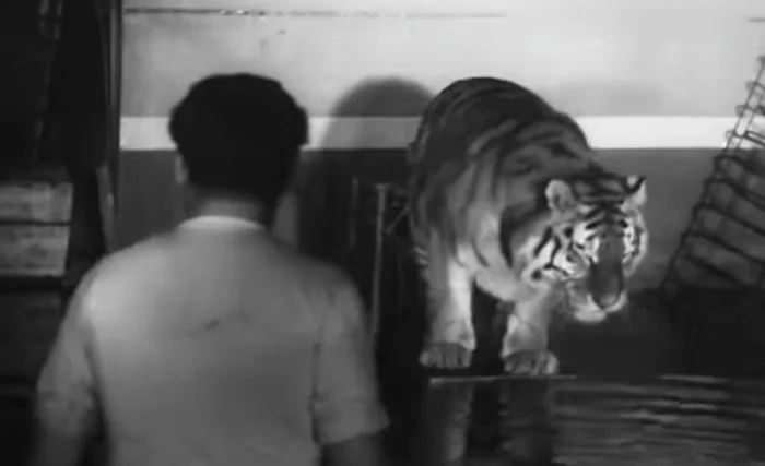 Тогда Константин Константиновский решил пойти на хитрость. Он запустил в клетку с Леоновым поросенка и ткнул его вилкой, чтобы тот завизжал. Именно после этого тигры подбежали к клетки и стали прыгать на нее в попытках поймать визжащего поросенка.