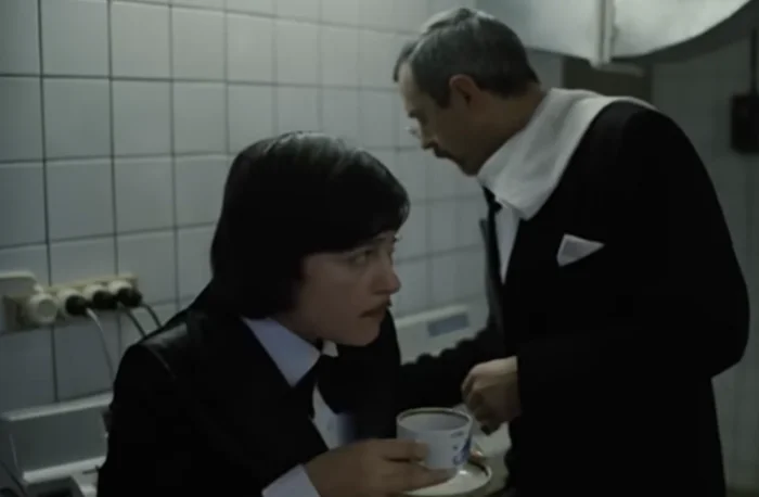13. Ресторан, в котором проходили съемки, был только недавно построен и еще не работал. В этой сцене, помимо режиссера, сыгравшего официанта, появились и другие члены съемочной группы, такие как оператор, художник (Александр Адабашьян) и др.