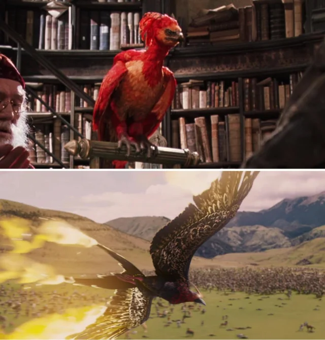 Впервые взрослые драконы появились в «Кубке огня», и они довольно сильно похожи на драконов из самого очевидного источника для сравнения — «Игры престолов». А ведь разница между двумя кадрами составляет около 10 лет. Образ драконов в популярной культуре уже устоялся, поэтому они везде выглядят плюс-минус одинаково.