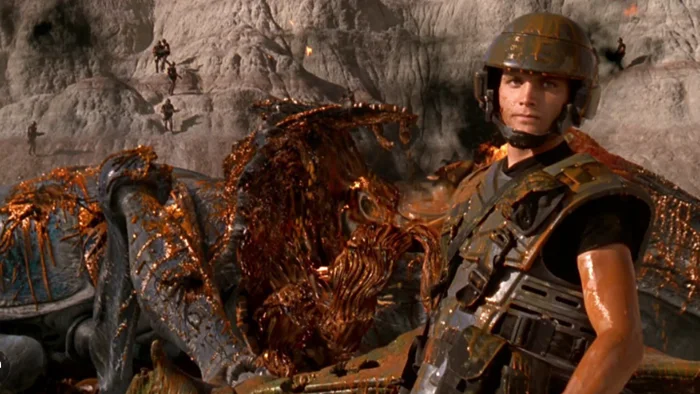 А между тем, сам оригинал, основанный на произведениях одного из величайших фантастов в истории Роберта Хайнлайна, представлял собой великолепный блокбастер с обилием весьма крутых по тем временам спецэффектов и экшона, крутым сеттингом и великолепными в своей мразотности монстрюками. До сих самых пор я не видел в кино никого и близко настолько же очаровательно-мерзкого, как жук-мозгун из финала фильма) Вы просто посмотрите на эту мразэллу)