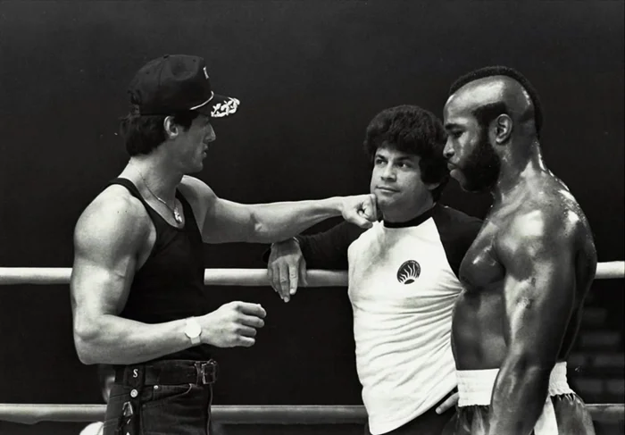 9. Сильвестр Сталлоне уже на ринге и показывает, куда надо бить, на съёмках фильма «Рокки 3»
