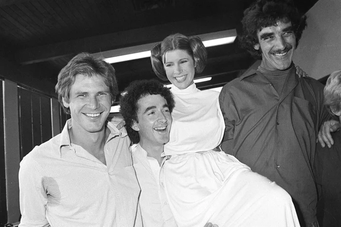 Харрисон Форд, Энтони Дэниелс, Кэрри Фишер и Питер Мейхью во время перерыва между съемками специального ролика для телевидения, 5 октября 1978 года