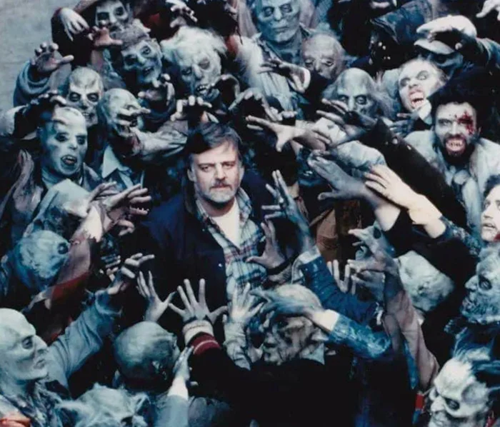 Режиссер Джордж Ромеро, окруженный зомби-массовкой