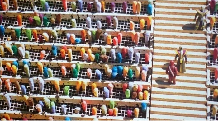 Чтобы заполнить трибуны, 450 000 наконечников ватных палочек были вырезаны, окрашены и вставлены в сетку.