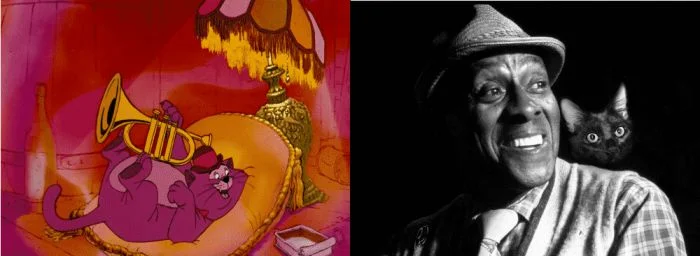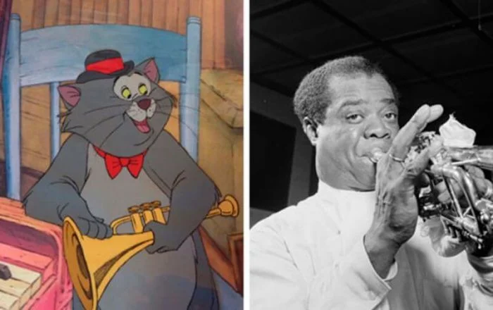 Первым был Скэт Кэт из мультфильма "Аристократы", а вторым - Луи из мультфильма "Принцесса и лягушка", который вышел на экраны 39 лет спустя.Первоначально кота-трубача назвали Сэтчмо - это было прозвище Армстронга, но музыкант не смог озвучить персонажа по состоянию здоровья. Тогда его заменил Скэтмен Крозерс, а имя персонажа изменили на Скэт Кэт.