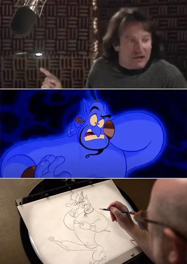 Чтобы убедить Уильямса принять участие в проекте, художники наложили анимацию джинна на запись со стендап-выступлением самого актёра. Комик идею оценил.Аниматор Эрик Голдберг сказал, что персонаж буквально олицетворяет Робина Уильямса, потому что актёр часто отходил от сценария и импровизировал."Никто не ожидал, что уже во время первой записи он начнёт пародировать знаменитостей, но мы оставили эти реплики в мультфильме".После смерти Уильямса в 2014 году Голдберг со слезами на глазах вспоминал совместную работу: "Он был настоящим джинном — исполнял наши желания".