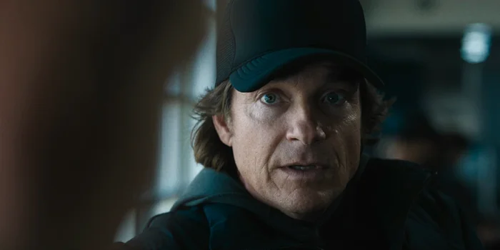 Итан глубоко фрустрирован. Это видно по его бровям, а ещё у Итана на протяжении фильма стремительно вырастают мешки под глазами. Он почему-то бросает сюжетный сканер багажа и идёт в сторонку, немножко посидеть в зале ожидания. Напротив него кто-то садится. Итан поднимает глаза и мы понимаем, что незнакомый голос — это парень в кепке.