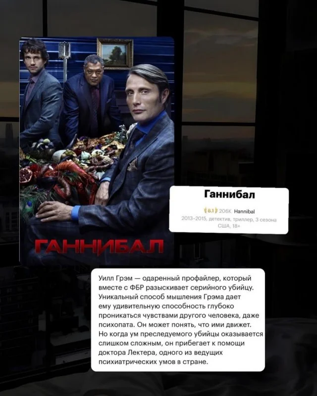«Ганнибал» — напряжённые отношения сыщика и гениального психиатра-каннибала.