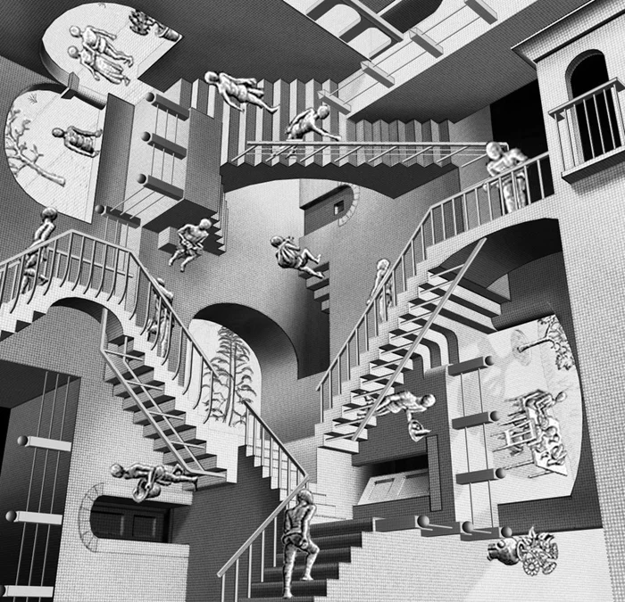 - Ну, и самое, пожалуй, интересное. Невероятный зал со множеством лестниц, который Сара находит в центре лабиринта, был создан по мотивам картины Мориса Эшера «Относительность».