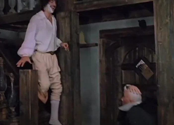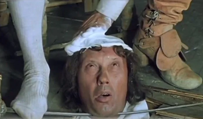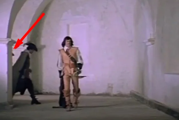Ну и видимо дублер не смог вовремя сориентироваться, из-за чего его просто вытолкнули в нужный момент. Как оказалось, вытолкнул дублера Валентин Смирнитский, сыгравший Портоса.