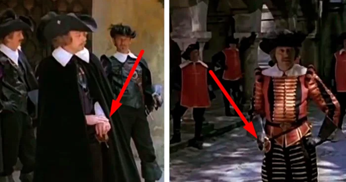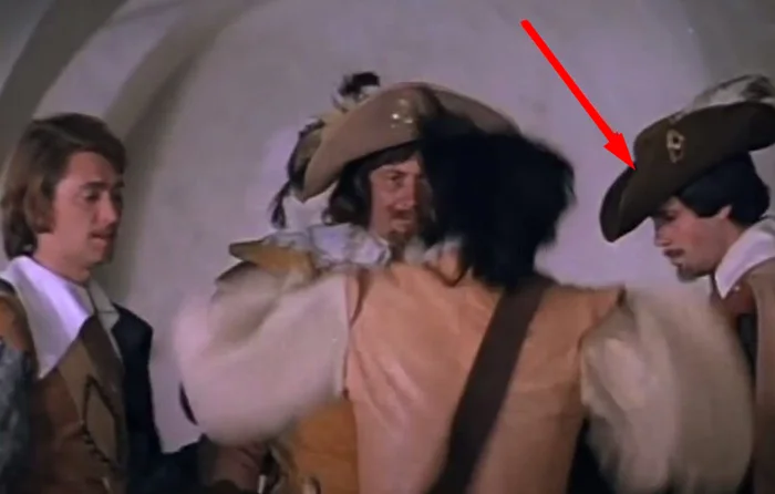 7. Арамис поет свою песню без шляпы на голове, после чего он направился в сторону своих друзей. Но при смене кадра шляпа вдруг очутилась на нем, хотя мушкетер не смог бы нацепить ее на себя с такой скоростью.