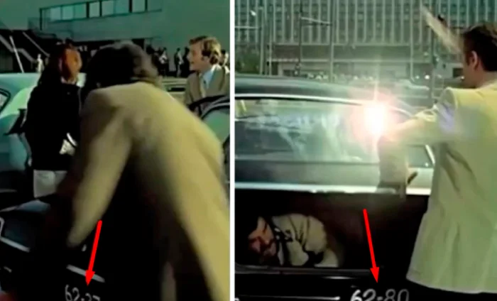 9. После приземления герои вместе с Андреем уезжают на одной "Волге", но приезжают на другой. Номера автомобилей отличаются.