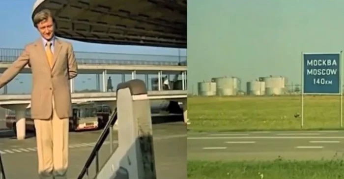 4. Самолет с героями садится на автостраду, и мы видим табличку, указывающую, что до Москвы 140 километров. Но вдруг на трапе появляется Андрей Миронов, за которым виден аэропорт "Шереметьево".