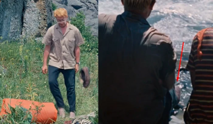 Однако обратите внимание на ноги Шурика: на нем снова ботинки. Вряд ли он стал бы надевать обувь, выходя из реки, чтобы вернуться к Нине.