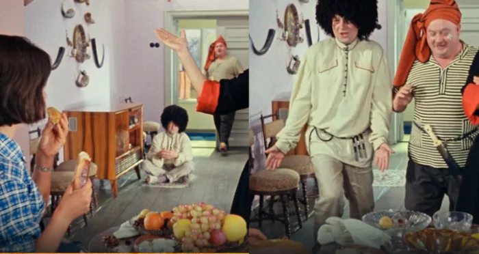 12. Также меня мучает вопрос о "магическом" моменте. Когда Шурик знакомится с кунаками, троица подходит от входной двери к столу. Но после приветствия они сядут. Но вопрос: куда они сели, если там не было ни стульев, ни мебели? Они не переступали через стулья.