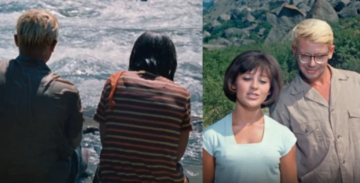 2. Перед тем как залезть в спальный мешок, Шурик снимает ботинки. После падения в реку, он и Нина сидят у воды, дрожа от холода.