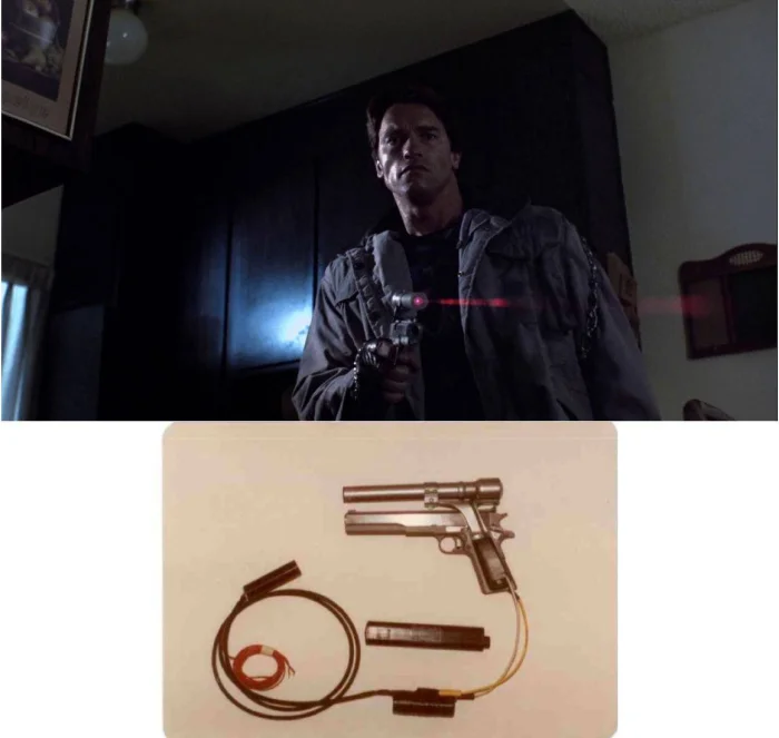 3. В фильме «Терминатор» (1984) для пистолета был создан специальный лазерный прицел, так как в то время они были дефицитом. Для его работы потребовался внешний источник питания и провод с переключателем, который проходил через рукав и включался другой рукой из кармана куртки.