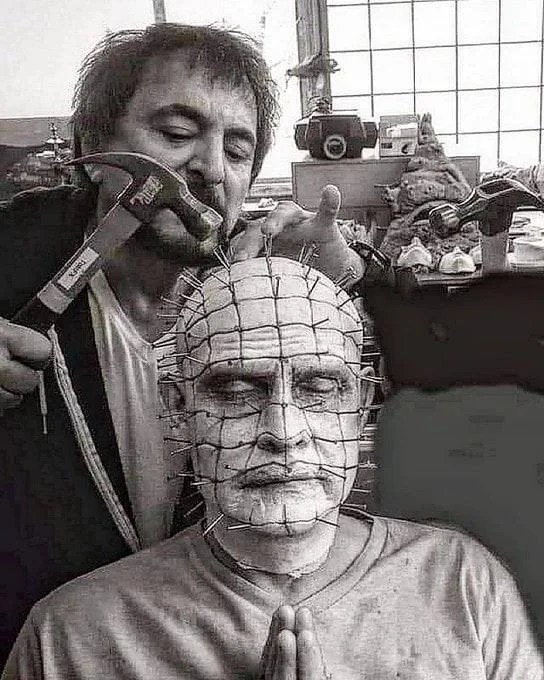 7. Том Савини приобрел известность благодаря роли Секс-машины в фильме Роберта Родригеса «От заката до рассвета» (1995), однако его основная профессия — постановщик спецэффектов и гримёр. На фотографии он изображен за работой, создавая образ знаменитого Пинхеда (хотя это не для этого фильма).