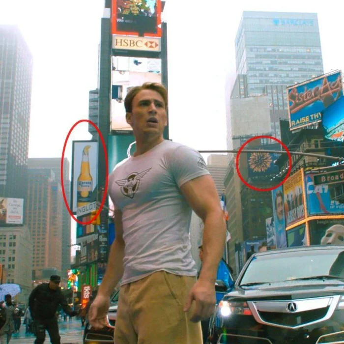 14. В конце фильма, когда Кэп просыпается после 70-летней комы и выбегает на оживленную улицу, за его спиной можно увидеть рекламу пива «Корона» и рекламу макарон Barilla, напоминающую изображение вируса. Интересное совпадение!