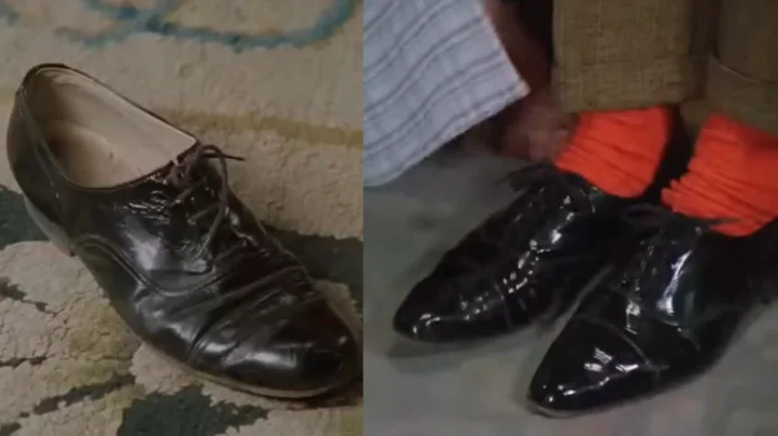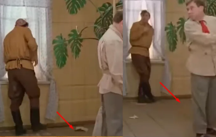 14. На общем плане у героя Савелия Крамарова брюки довольно длинные. Но когда нам показывают его ботинки крупным планом, брюки становятся такими короткими, что мы можем увидеть его желтые носки.