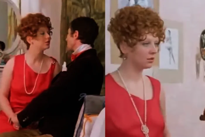 7. Когда Анатолий и Зинаида уединяются в квартире, Толика постоянно что-то отвлекает. В этот момент на Зинаиде красное платье и жемчужное ожерелье, а на плече брошь.