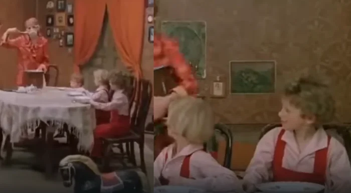 8. В начале новеллы "Забавное приключение" обратите внимание на стулья, на которых сидят дети. Спинки стульев старшего и среднего сыновей главного героя находятся на уровне их головы. Но при крупном плане спинки стульев значительно ниже.
