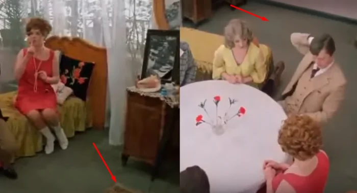 10. Когда Барыгин-Амурский и Зинаида садятся на кровать в комнате у Софочки, рядом с тумбочкой видно кусочек ковра. Но в сцене, когда шестеро героев собираются за одним столом, ковра уже нет.
