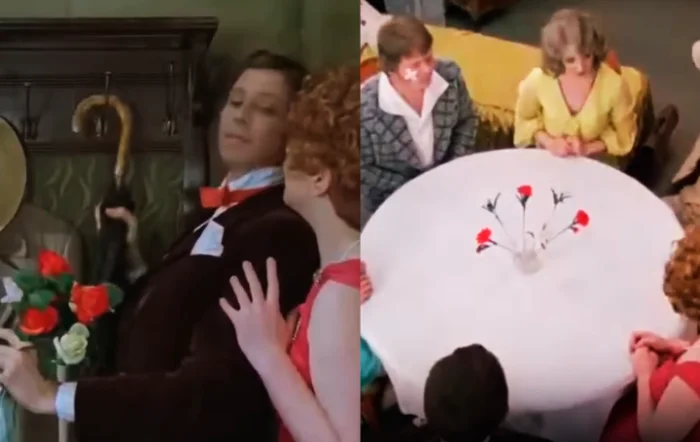 12. Теперь давайте перейдем к новелле "Свадебное происшествие". Помните сцену, когда рыжую девушку с тарелками случайно толкают, и та роняет тарелки, которые аккуратно располагаются на столе?