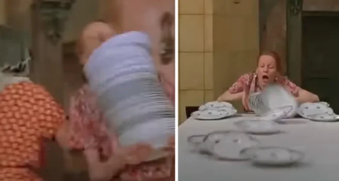 И нет, ошибка не в том, что тарелки аккуратно раскладываются. Обратите внимание на то, что те, кто толкнул девушку, вдруг исчезают в следующем кадре.