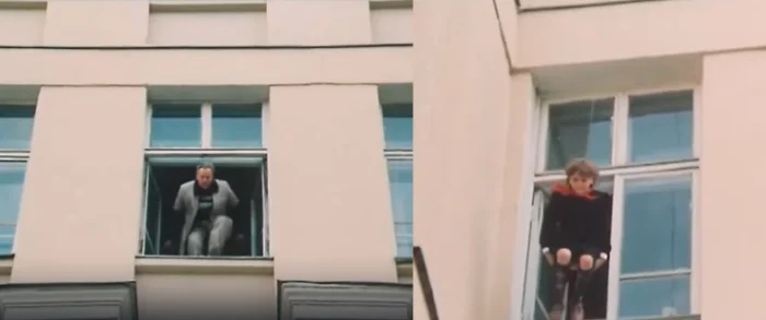 Кроме того, замечу (это не ляп, а просто наблюдение), что во время прыжка видно, что выпрыгивают не Наташа Гусева и Вячеслав Невинный, а их дублеры. Хотя дублеру Невинного, наверное, стоило бы надеть парик, чтобы различие было менее заметным, так как залысины каскадера бросаются в глаза.