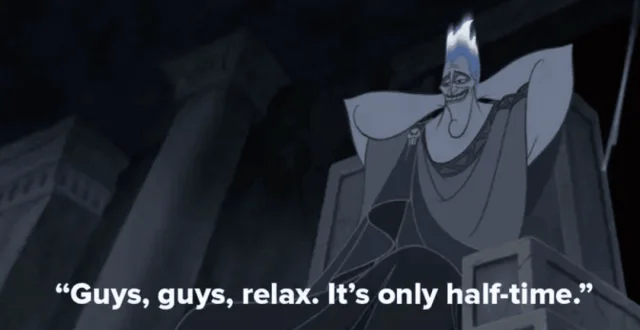 В «Геркулесе» (1997) Аид говорит: «Ребята, расслабьтесь. Прошла только первая половина» ровно на 46-й минуте — в середине 92-минутного фильма.