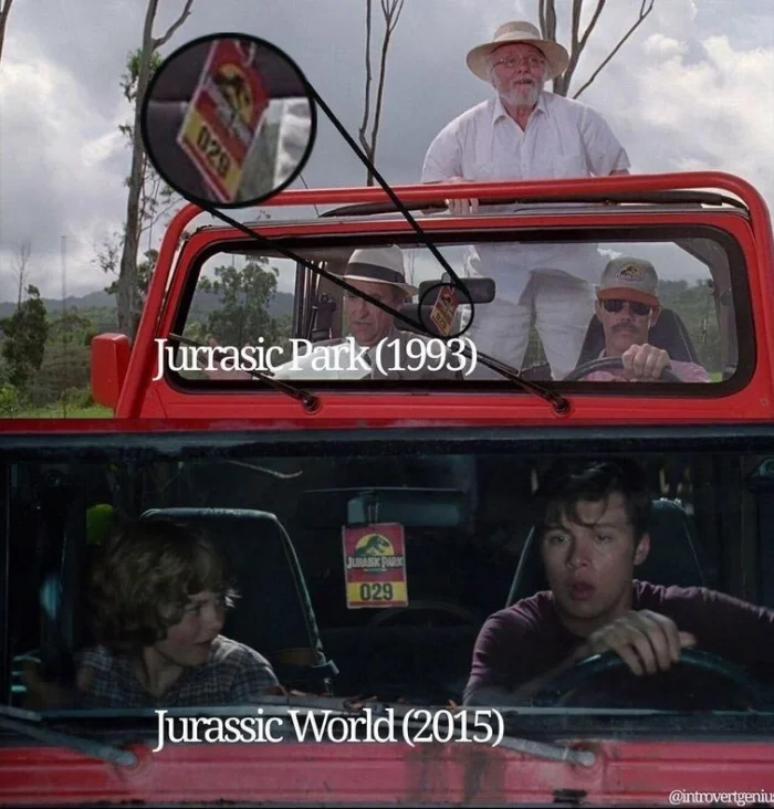 3. Серьёзное внимание к деталям: В "Мире Юрского периода" (2015) использовался тот же джип Wrangler, что и в оригинальном "Парке Юрского периода" (1993) — модель 1992 года.