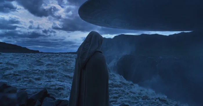 Сцена, происходящая у водопада, задает общий тон всему фильму. Здесь мы видим загадочную фигуру - огромного, молчаливого существа с полупрозрачной кожей и глазами, лишенными белков. Этот необычный персонаж выпивает странную, непонятную жидкость, после чего его тело начинает разрушаться и распадаться на составляющие его молекулы. Именно из этих молекул зарождается новая жизнь, символизируя циклическую природу существования.
