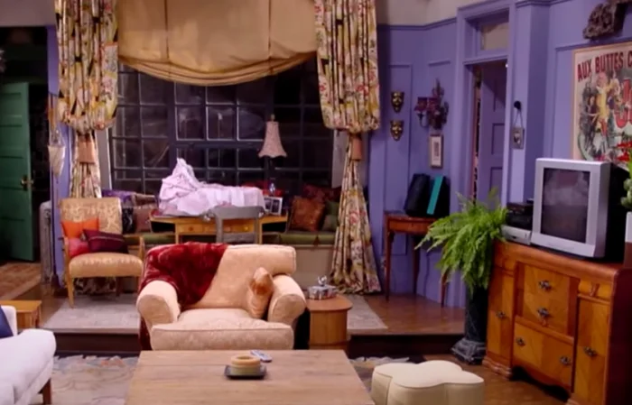На входной двери должно было висеть зеркало в рамке, но оно было разбито, и художник-декоратор решил оставить пустую рамку как фишку сериала. Стены в квартире Моники были сделаны сиреневыми, чтобы привлечь аудиторию.