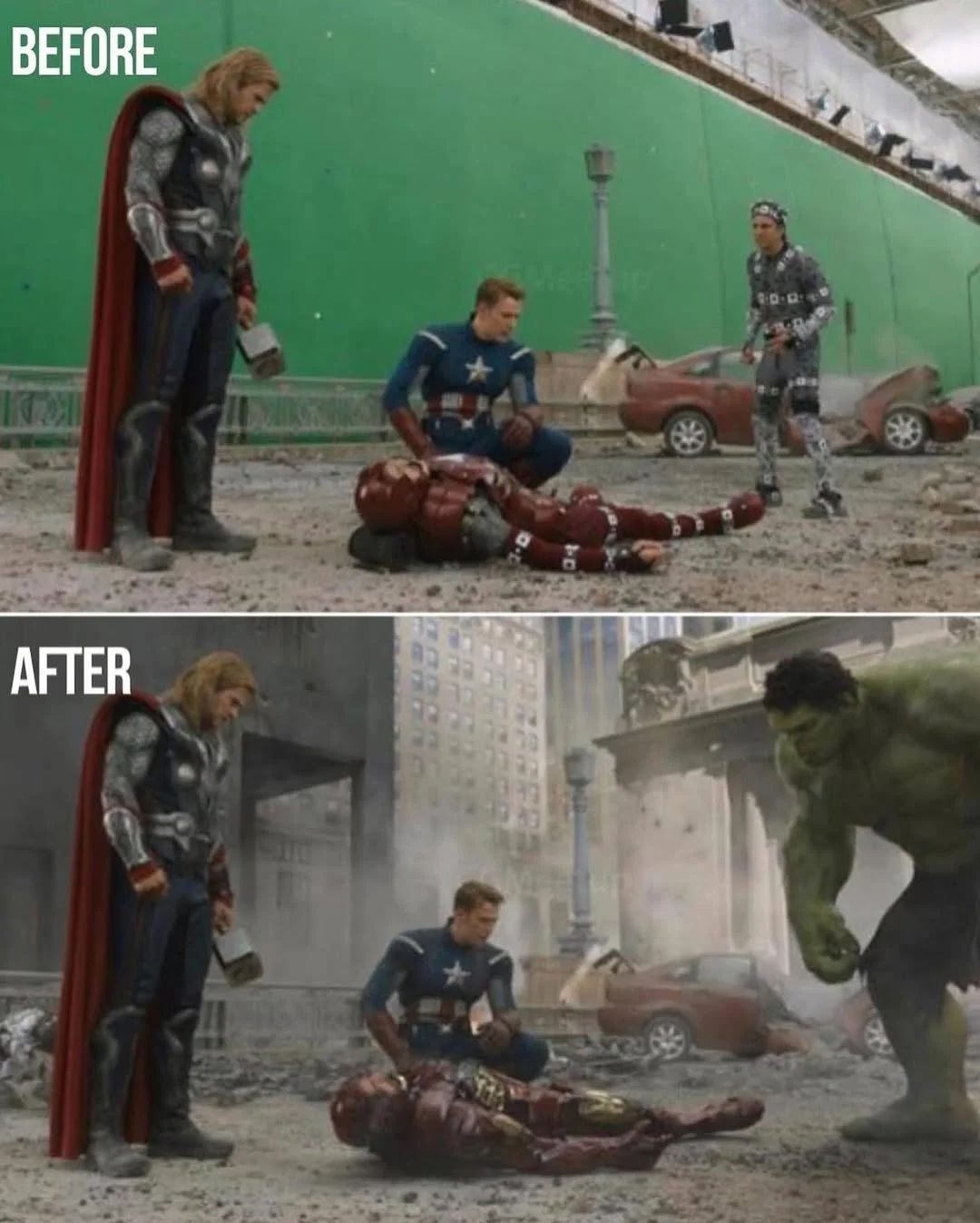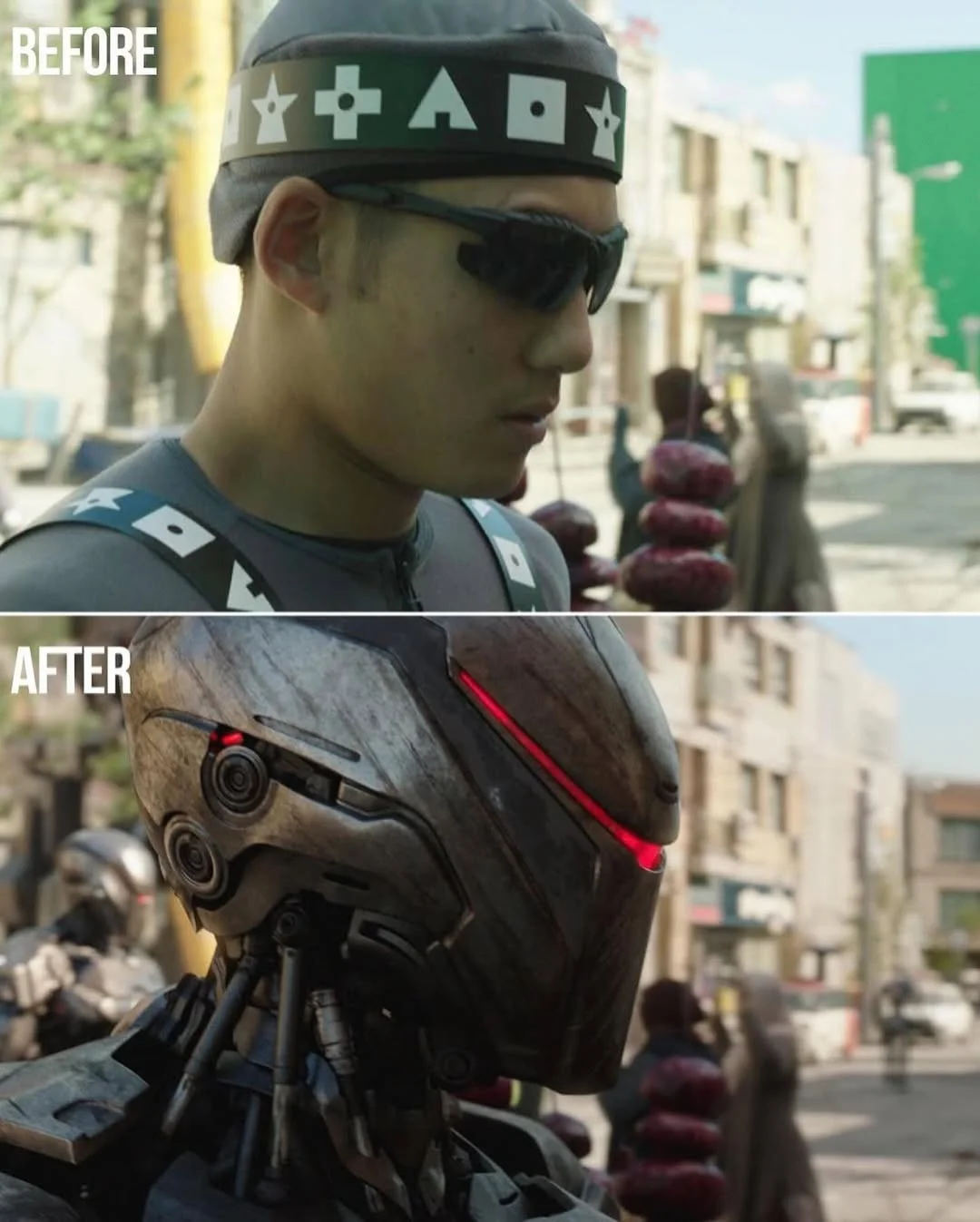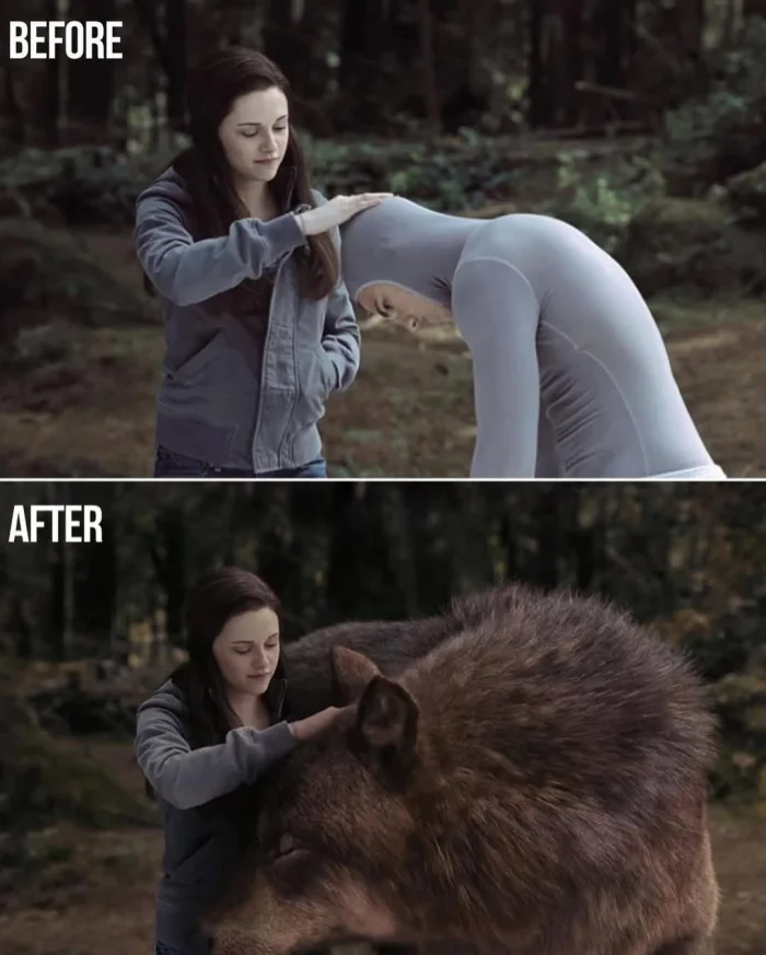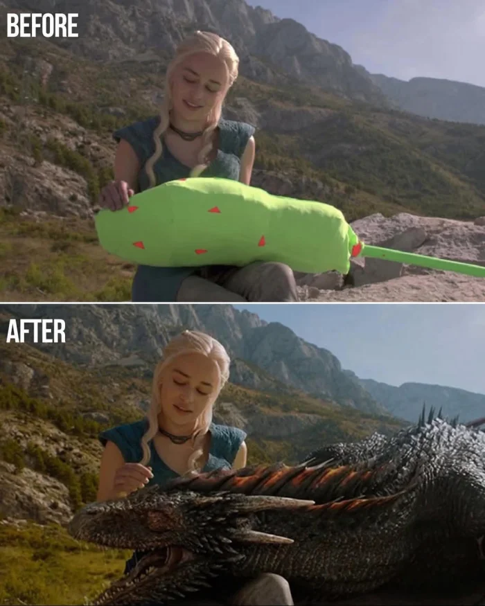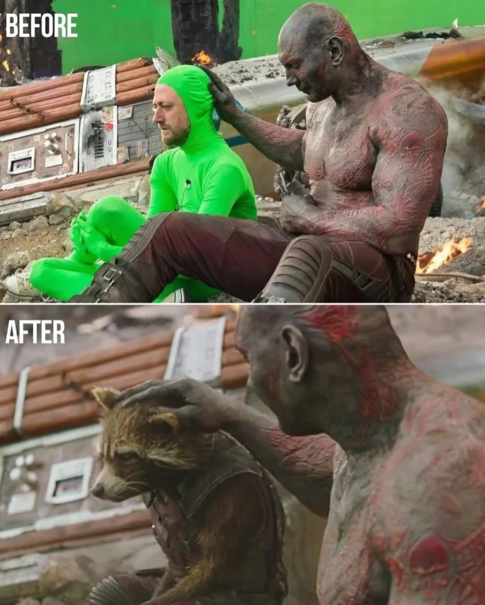 На съемках многие сцены выглядят на удивление просто и даже комично. Вместо грозных чудовищ — ярко-зеленые макеты, вместо фантастических пейзажей — однотонные фоны, а вместо эпичных сражений — пустые павильоны. Актерам приходится взаимодействовать с объектами, которых в реальности не существует, и представлять себе врагов, монстров или целые миры, которые появятся лишь спустя месяцы работы специалистов.