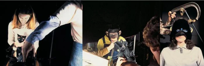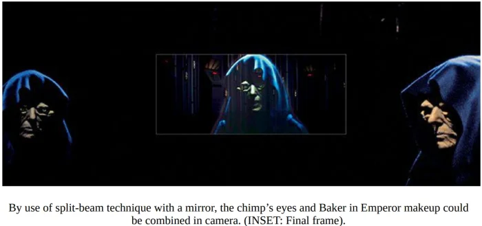 Для совмещения отдельно снятого лица императора и глаз шимпа использовалась техника "расщепленного луча с зеркалом" в специально созданном для этого цифровом оптическом принтере