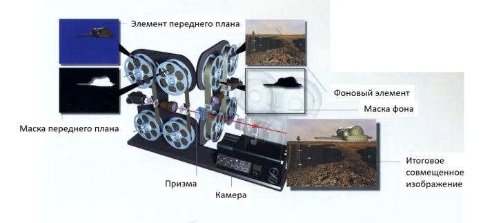 Общий принцип работы оптического принтера - обе картинки совмещаются в призме, суммарное изображение из которой поступает на видоискатель камеры