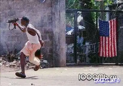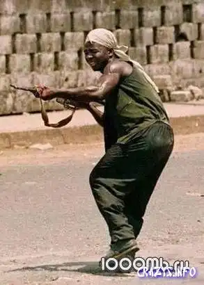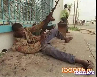 Фото 5 - Стрельба с упором в бедро. Главное здесь - переорать автомат. Тогда испуганный противник какается и убегает. На заднем плане - стрелок копает автоматом касаву.