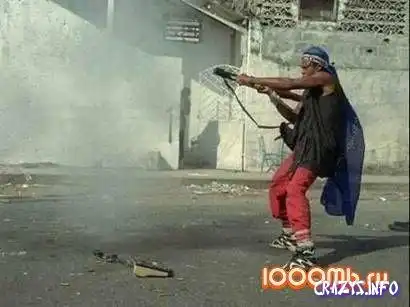 Итак, на фото 1 : Стиль `Верхний дзэн` - основной способ точной стрельбы. Поражение достигается быстрым движением оружия в горизонтальной плоскости как при покосе травы. Непораженный при этом противник может быть также испуган полуспущенными штанами или ужимками стиля `злая обезьяна` и танцующими движениями, которыми сопровождается процесс стрельбы. Дополнительные очки присуждаются за пластику, стиль одежды и боевой окрас. Чтоб не пугаться самому, можно закрывать глаза, как это с успехом делает креатура на снимке .