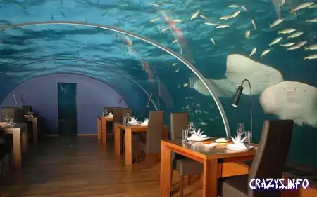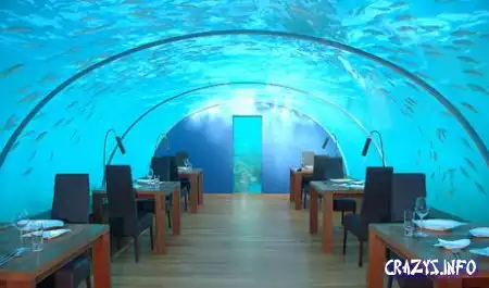 На Мальдивах, в Индийском океане, открылся первый подводный ресторан от сети отелей "Хилтон" на глубине пяти метров. Не с иллюминаторами, а целиком стеклянными стенами и потолком.