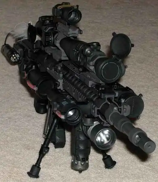 Если присмотреться, то там просто на 1 прямо скажем не самого большого калибра ствол насажно дофига оптических и не только прицелов. Наверное это вообще мелкашка какая-то. С ней кроме как целиться ничего и делать нельзя.
