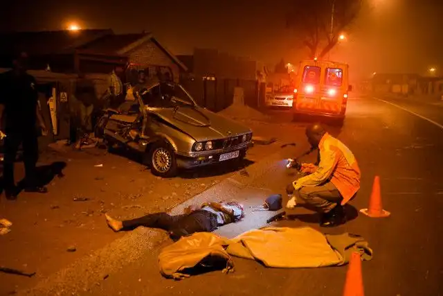 Полицейский фотограф документирует сцену ужасающей автомобильной катастрофы в Soweto. Водитель потерял контроль над его bmw. Погиб сразу же