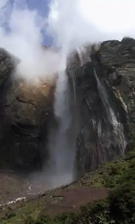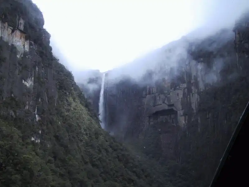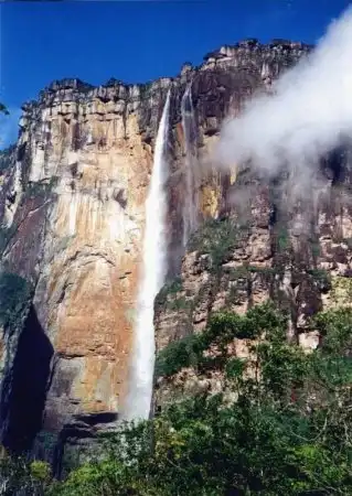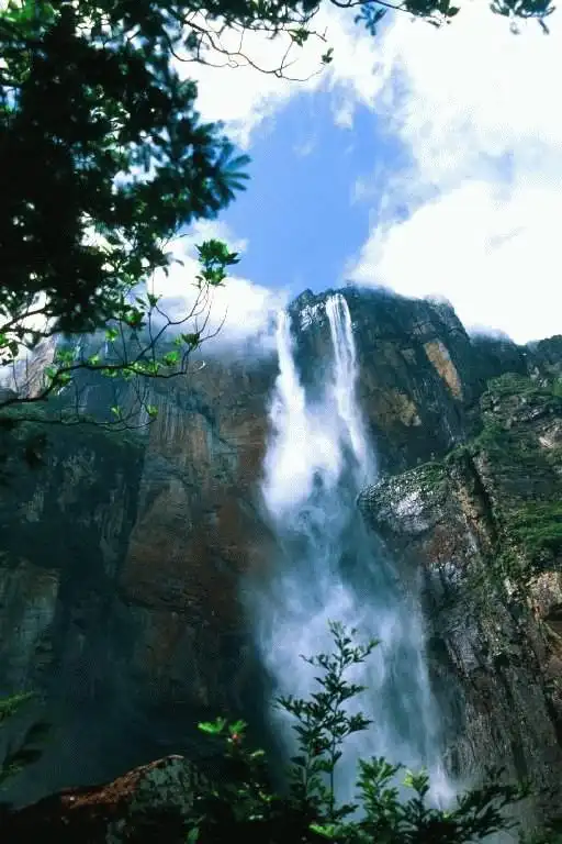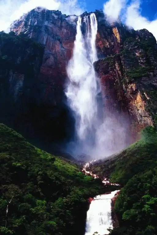Angel Falls - огромный водопад (979 метров) находится в Canaima National Park (Венесуэлла). Огромный валун на вершине горы разбивает реку на два потока, которые подобно крыльям ангела устремляются вниз с почти километровой высоты