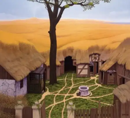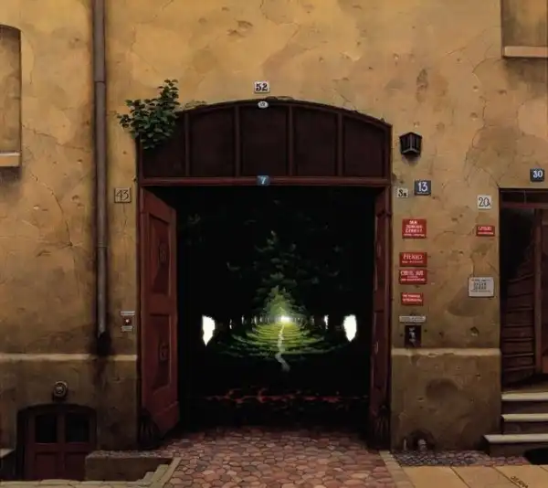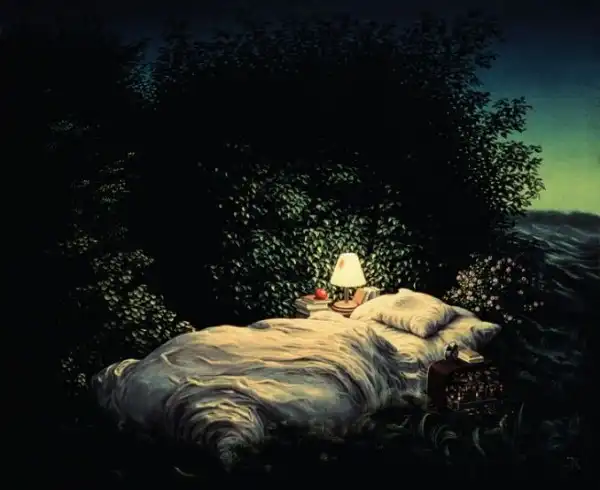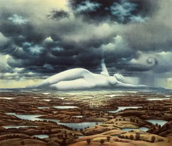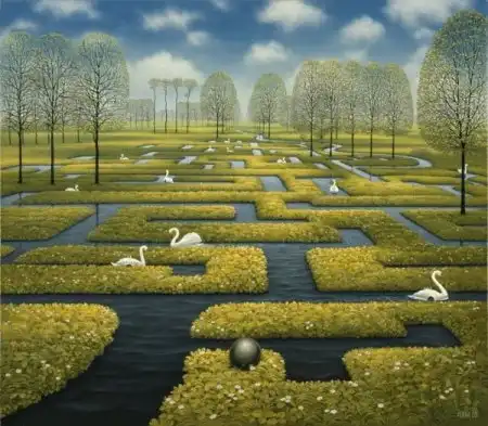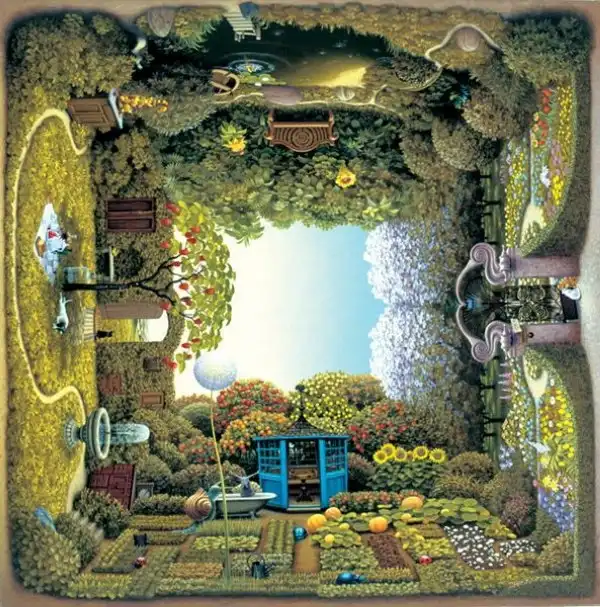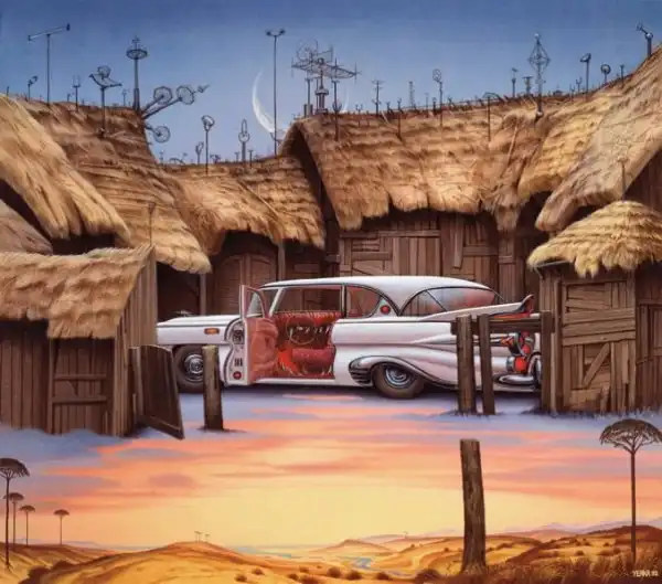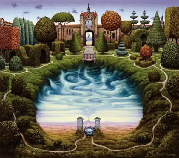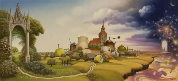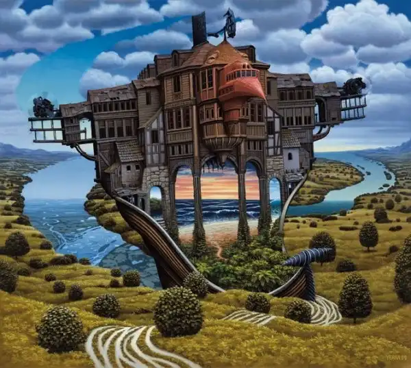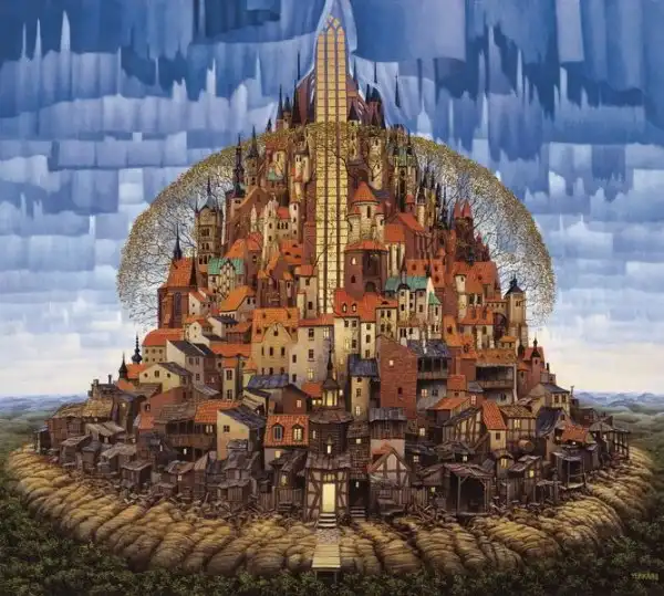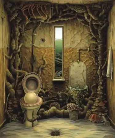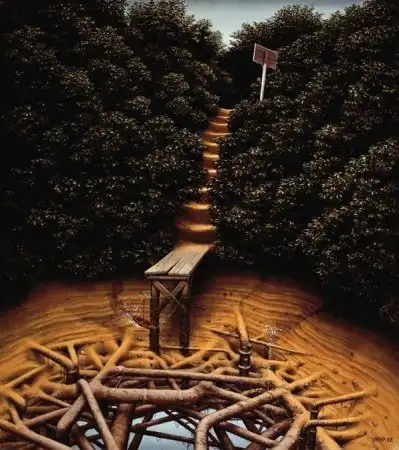 Сильно напоминает средневековые полотна Хиеронимуса Босха - графика абсурда. Стиль на большого любителя аллегорий и намёков. Ассоциативно, надо потратить время на более скрупулёзное рассморение. А почему имя художника не указали в заголовке? Небезынтересно было бы...