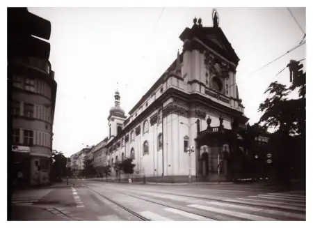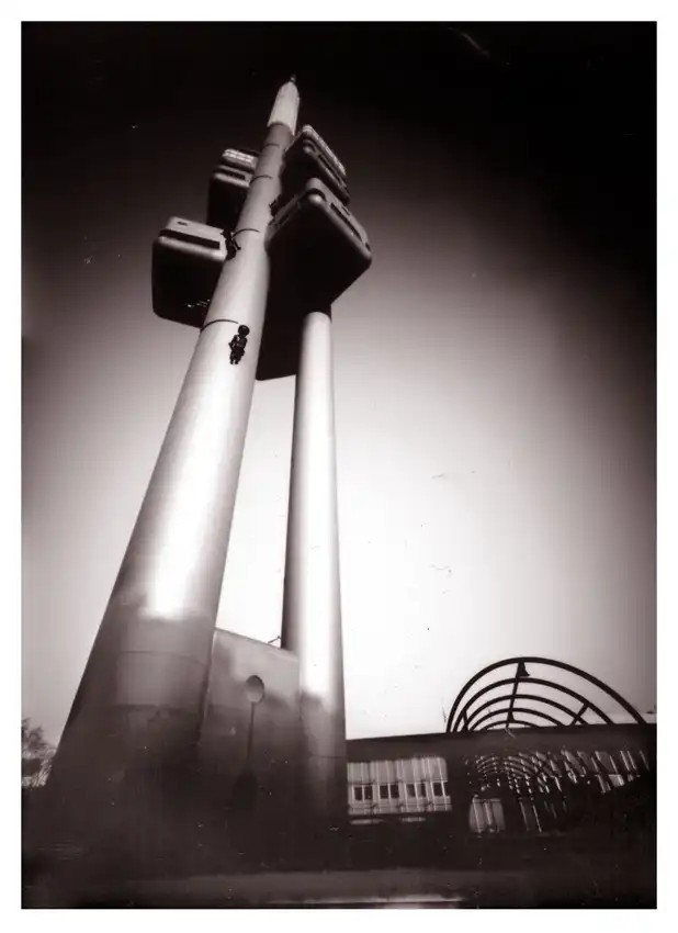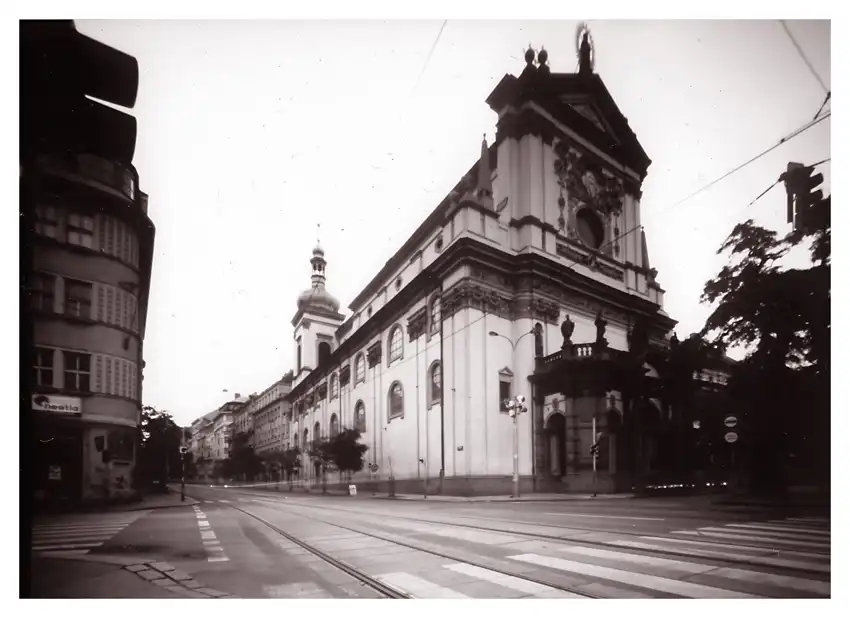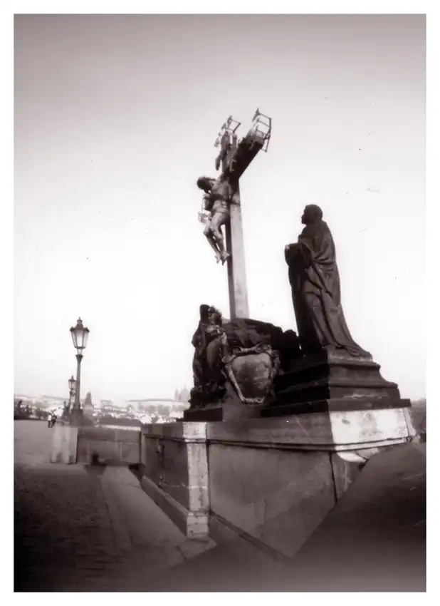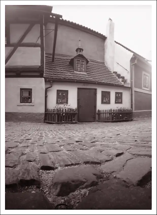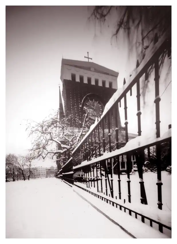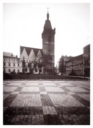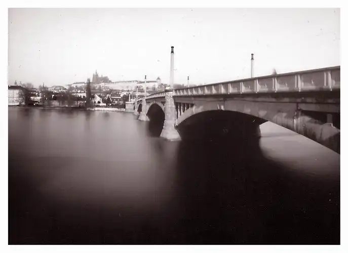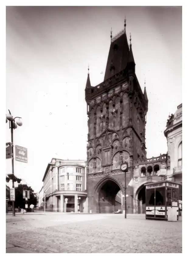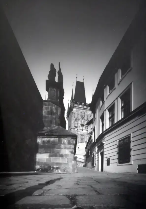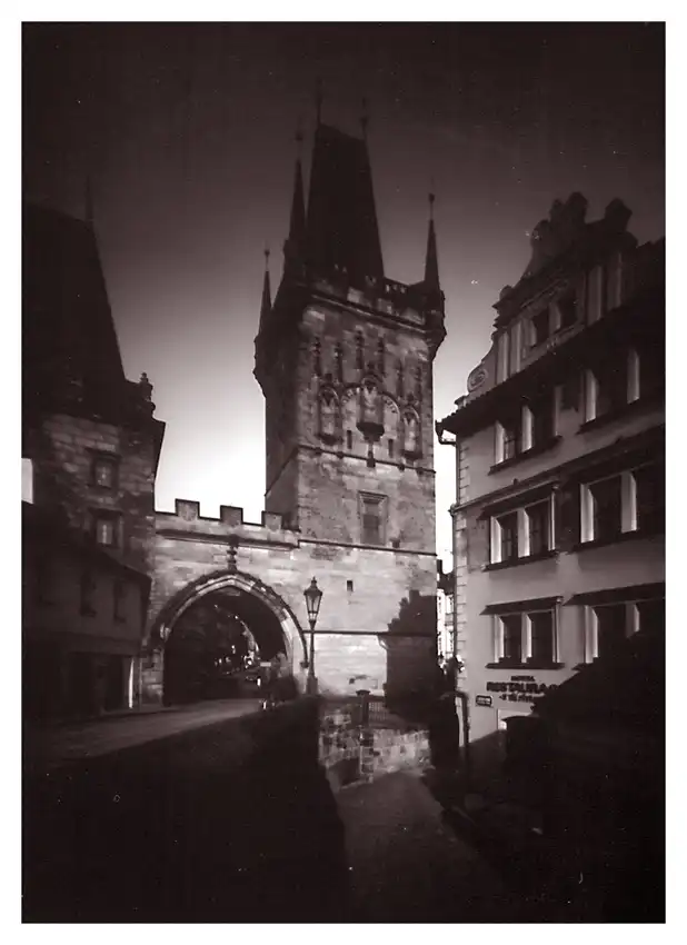Ниже фотографии всё той же Праги, сделанные с моими друзьями с помощью камеры – обскуры. В жестяную банку вдоль стенки вставили фотобумагу, а в противоположной стенке проделали дырочку. Банку ставили на некоторое время напротив разных зданий. Затем изображения на бумаге проявили и получились вот такие интересные “готичные” фотографии :). Машины и люди, на фотках не получились, они двигались слишком быстро.