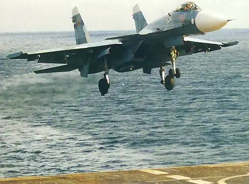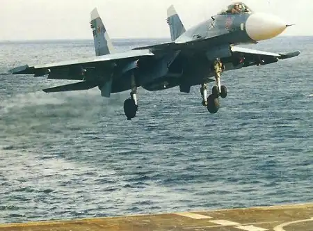 Су-33 — первый отечественный корабельный истребитель горизонтального взлета и посадки. В настоящее время это единственный самолет данного типа, имеющийся на вооружении ВМФ России.Официально истребитель под обозначением Су-33 был принят на вооружение ВМФ России Указом Президента РФ от 31 августа 1998 г.