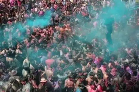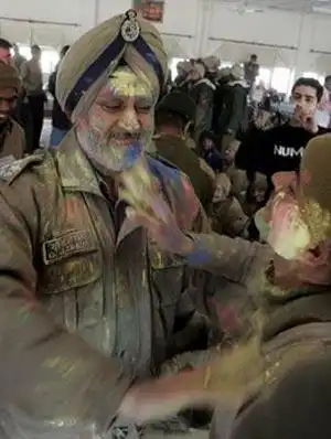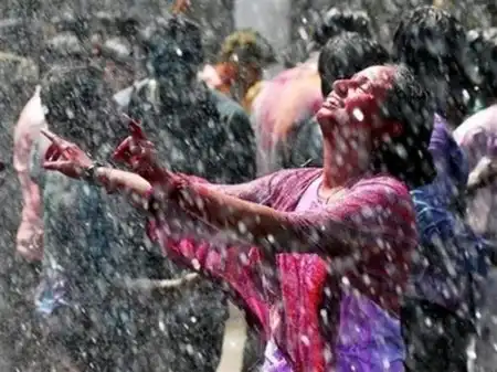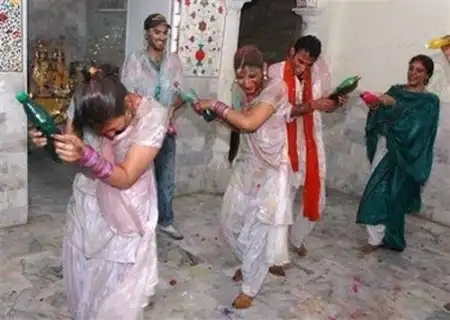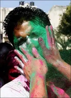 Начинается всеобщее обливание подкрашенной пудрой «гулал» водой шести ярких цветов — огненно-красного, зеленого, синего, желтого или серебристого.
