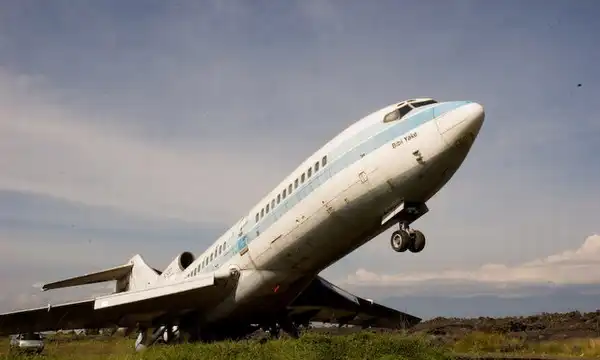 Застыл как будто собирается взлететь .... , но увы "Он уже с 2002 года стоит здесь. Обычно, правда, в горизонтальном положении. Но иногда его поднимает ветром, вот как сегодня. Потом его снова опускают. А стоит он тут, с тех пор как извергся вулкан, и пол-полосы залило лавой. Да, здесь, это конечно Гома, ДР Конго.". Далее, за самолетом, видно давно засохшую лаву. Говорят она остывала в течении двух лет. А в первое время на ней можно было жарить яичницу.