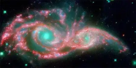 Эти интенсивно двигающиеся галактики приняли форму гигантской маски. Ледяные синие глаза - это ядра двух сливающихся галактик, с названиями NGC 2207 и IC 2163, а сама маска - их спиральная периферия. Ложно-цветовое изображение состоит из инфракрасных данных рентгеновского телескопа Spitzer (красный цвет) и видимых для нашего глаза данных космического телескопа Hubble (синий и зеленый цвет).
