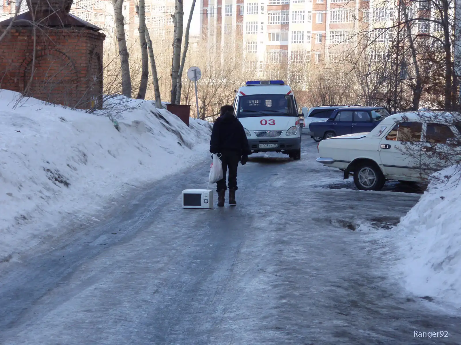 по-меому, как раз в скорую он и направляется! а микроволновку прихватил, чтоб не скучно было лежать